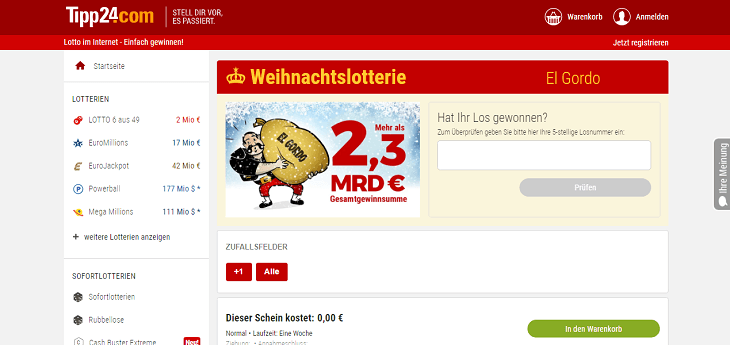 Bei Tipp24 wird auch El Gordo angeboten. El Gordo ist die spanische Weihnachtslotterie und jedes Jahr erzielt die Lotterie sehr hohe Einschaltquoten. Dabei schauen sehr viele Menschen in Spanien zu und hoffen, dass sie mit ihren Losen einen Gewinn erhalten werden. Dass ungefähr 15% aller Lose etwas gewinnen ist für die Popularität natürlich immens förderlich. Nur wenige andere Lotterien bieten so gute Gewinnchancen an und es ist positiv zu werten, dass El Gordo Tipp24 ebenfalls in sein Angebot aufgenommen hat.